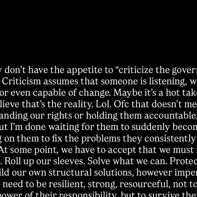 That is why Abigailâs conclusion, however heartfelt, carries a political risk. When she suggests that criticism no longer matters and that our energy is better spent tending to the small things within our reach, she is not just describing a coping strategy, she is helping to naturalise a particular political arrangement: a state that fails, a public that adjusts, and a governing class that learns it can survive crisis after crisis without fundamentally changing. Once failure is accepted as immutable, crisis management stops being about repair and becomes a permanent mode of rule. The normalization of crisisâfloods, blackouts, institutional scandals, policy collapsesâgradually erodes any sense of what effective, legitimate governance might look like. Instead of asking why institutions keep breaking down, people are encouraged to ask why they themselves are not coping better.
